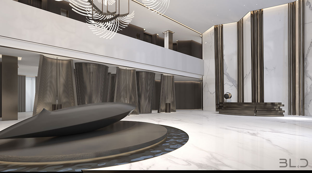 大堂以大尺度挑高设计,加上有序交互的几何形体与线条,让空间极具延展性。九尊水滴艺术装置成为大厅另一点睛之笔,设计师伽马取意“九眼水滴,禅心观上”。从空中飞泄而下的艺术灯饰,构思于苏州非遗文化“折扇”。晶 莹透亮似羽似扇的造型,表达轻盈与厚重,质朴与力量。