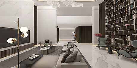 柔然舒适的布艺与地毯呼应,营造轻松愉悦的氛围;立面书架增添一份书香静默的惬意闲暇;艺术造型的水晶吊灯,就像是空间流动的音符,奏出灵动的韵律。纵使外界喧嚣袭来,屋内依然保持从容生活态度,符合业主对现代元素与轻奢感的追求。
