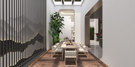 天窗茶室与客厅相连,此处运用东方元素,立面采用格栅山水装饰和圆形窗格造型,恬淡雅致、气韵生动,于素简中透出东方禅意。客厅、酒吧、茶室与此共享独成风格,又融洽贯通,集功能、美观,实用于一体。